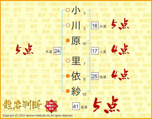 小(3画)川(3画)原(10画) 里(7画)依(8画)紗(10画)