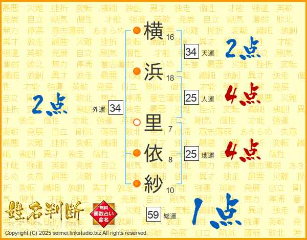 横(16画)浜(18画) 里(7画)依(8画)紗(10画)