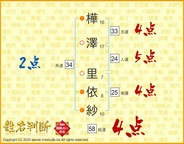 樺(16画)澤(17画) 里(7画)依(8画)紗(10画)