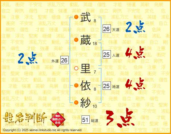 武(8画)蔵(18画) 里(7画)依(8画)紗(10画)