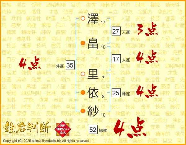 澤(17画)畠(10画) 里(7画)依(8画)紗(10画)