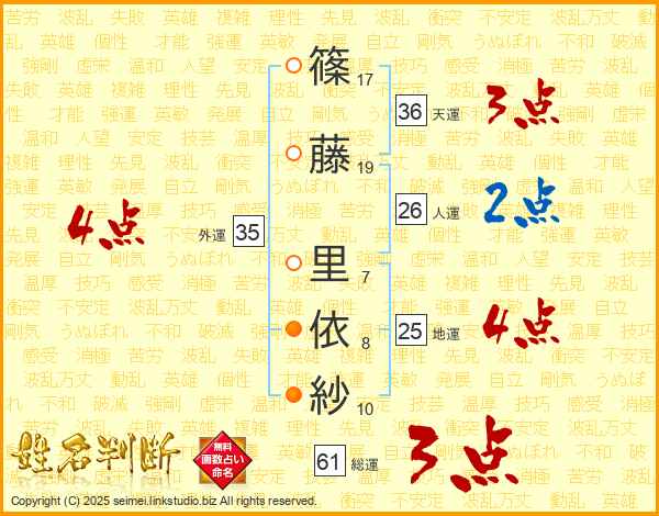 篠(17画)藤(19画) 里(7画)依(8画)紗(10画)