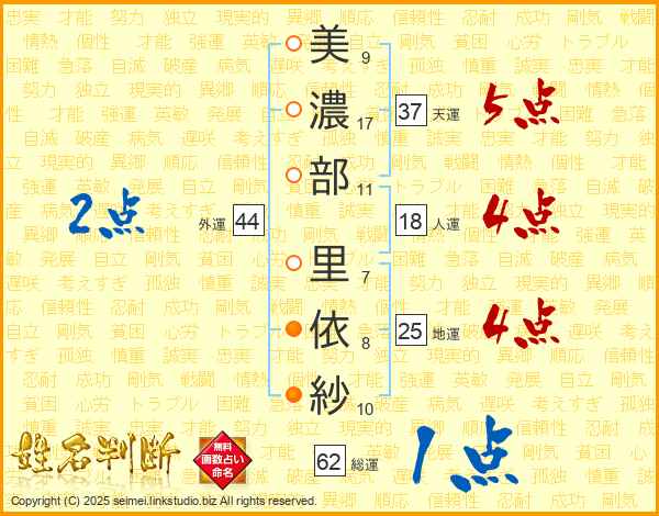 美(9画)濃(17画)部(11画) 里(7画)依(8画)紗(10画)
