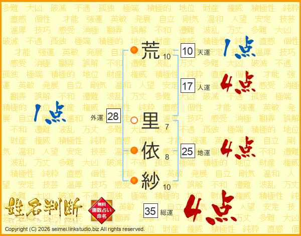 荒(10画) 里(7画)依(8画)紗(10画)
