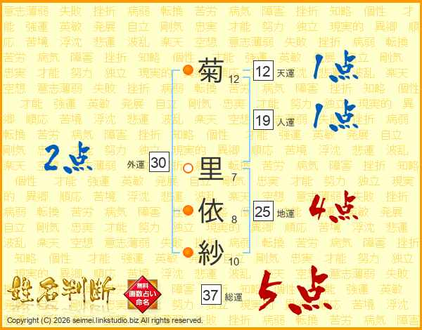 あなたの人生を表す1番重要な運勢です。生涯を通じて影響する総合運となり、主に50歳以降の晩年期に影響を及ぼします。苗字と名前の合計画数。