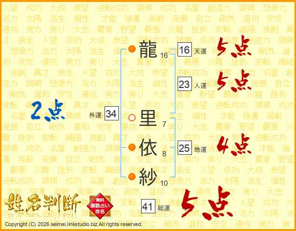 龍(16画) 里(7画)依(8画)紗(10画)