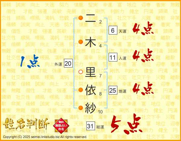 二(2画)木(4画)  里(7画)依(8画)紗(10画)