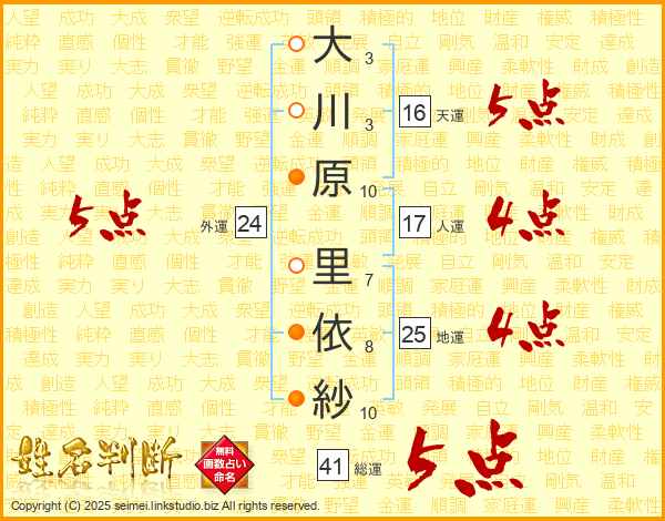 大(3画)川(3画)原(10画) 里(7画)依(8画)紗(10画)