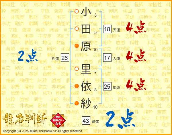 小(3画)田(5画)原(10画) 里(7画)依(8画)紗(10画)