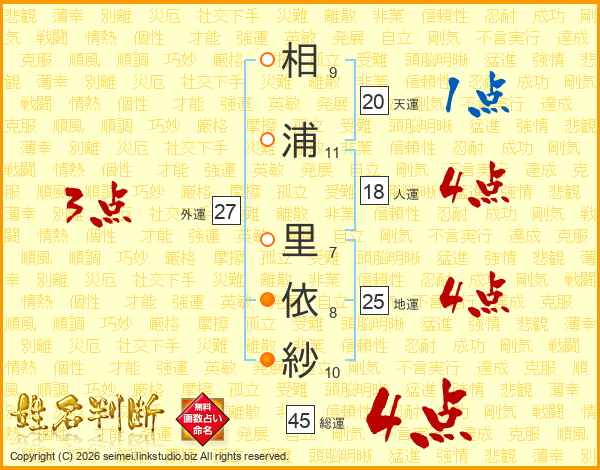 相(9画)浦(11画) 里(7画)依(8画)紗(10画)