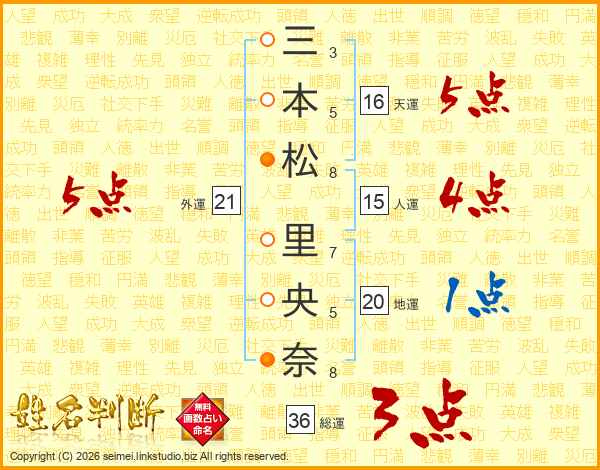 三本松里央奈さんの総運は36画の3点!