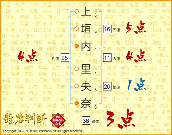 上(3画)垣(9画)内(4画) 里(7画)央(5画)奈(8画)