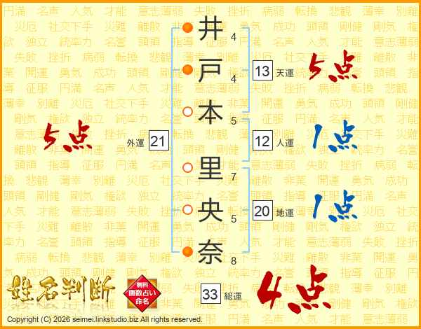 井(4画)戸(4画)本(5画) 里(7画)央(5画)奈(8画)