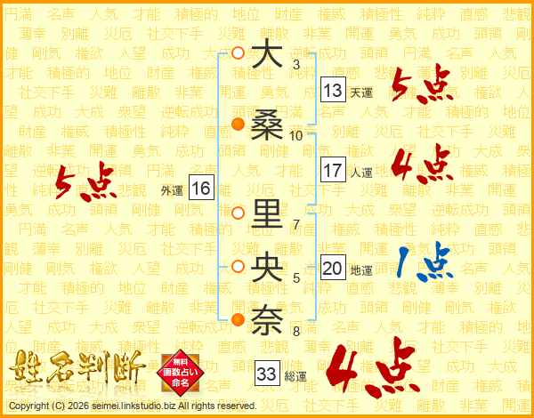 大桑里央奈さんの総運は33画の4点!