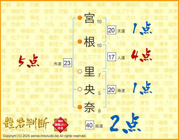 宮(10画)根(10画) 里(7画)央(5画)奈(8画)