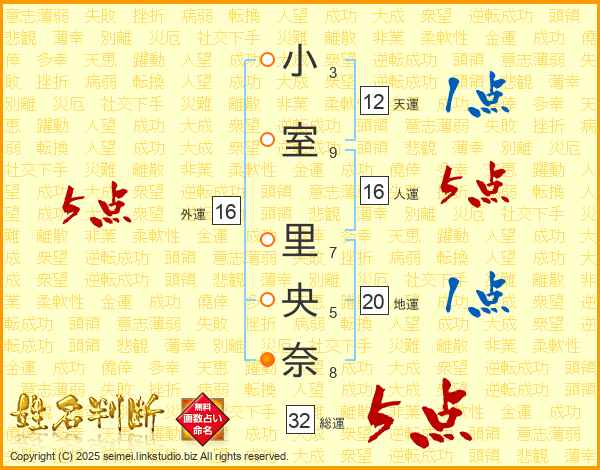 小(3画)室(9画) 里(7画)央(5画)奈(8画)