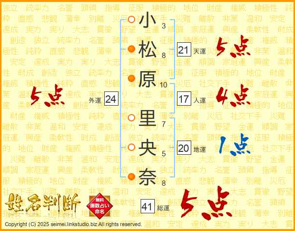 小(3画)松(8画)原(10画) 里(7画)央(5画)奈(8画)