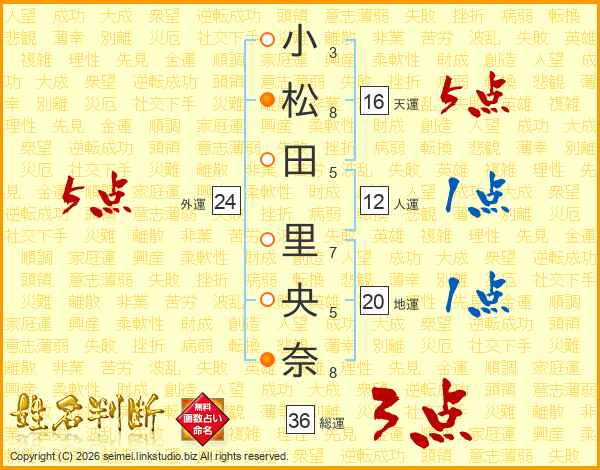 小(3画)松(8画)田(5画) 里(7画)央(5画)奈(8画)