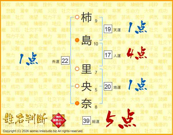 柿(9画)島(10画) 里(7画)央(5画)奈(8画)