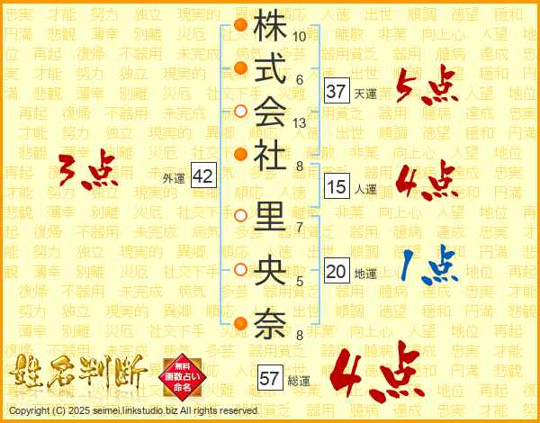 株式会社里央奈さんの天運は37画の5点!