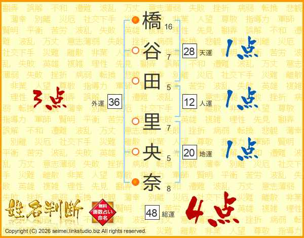 橋谷田里央奈さんの総運は48画の4点!
