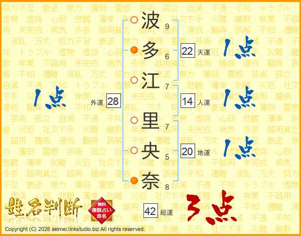 波(9画)多(6画)江(7画) 里(7画)央(5画)奈(8画)