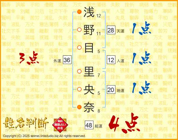 浅(12画)野(11画)目(5画) 里(7画)央(5画)奈(8画)