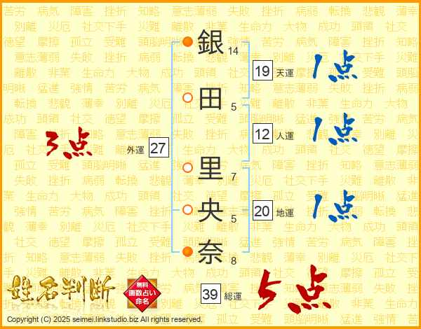 銀(14画)田(5画) 里(7画)央(5画)奈(8画)