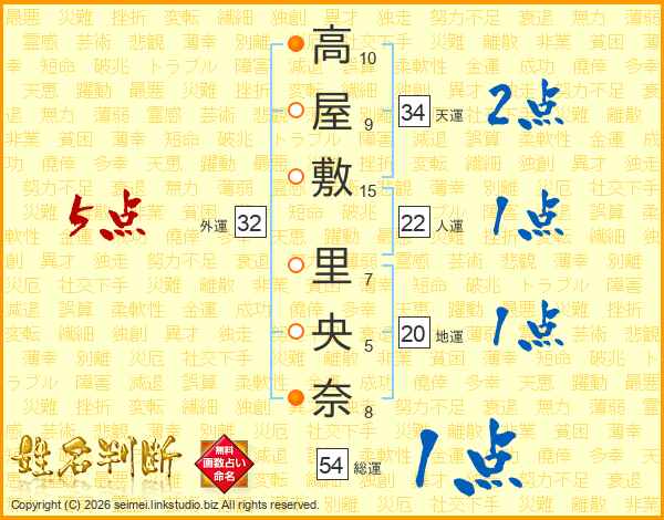 高(10画)屋(9画)敷(15画) 里(7画)央(5画)奈(8画)