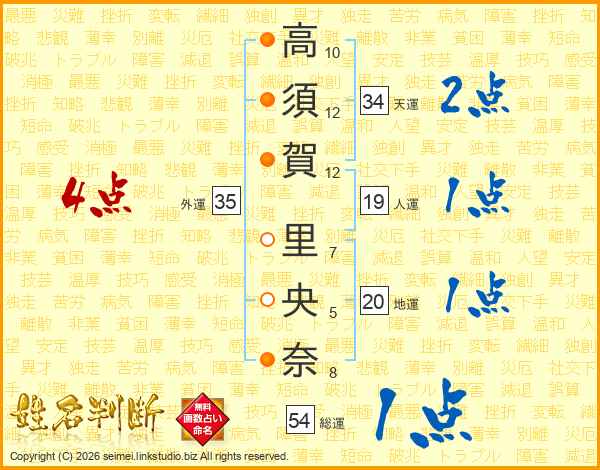 高(10画)須(12画)賀(12画) 里(7画)央(5画)奈(8画)