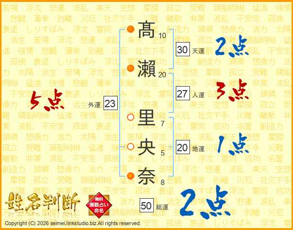髙(10画)瀨(20画) 里(7画)央(5画)奈(8画)