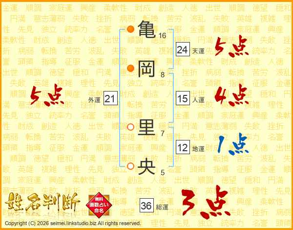 生活面を象徴する運勢です。外部から受ける影響力を表し、結婚運、家庭運や職場、環境への順応性を表します。総運から人運を引いた画数。姓や名が1文字の場合を除く。