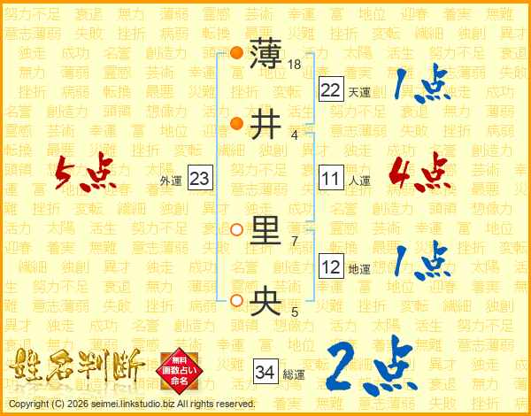 薄(18画)井(4画) 里(7画)央(5画)