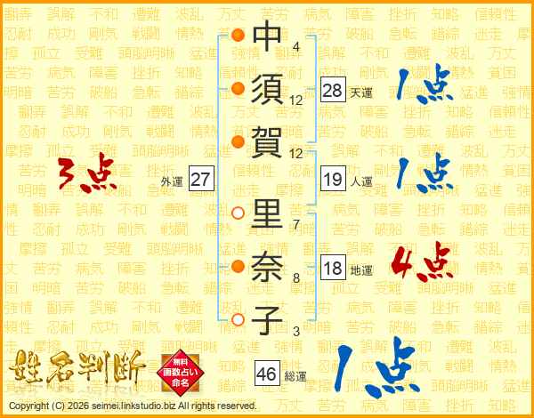 中(4画)須(12画)賀(12画) 里(7画)奈(8画)子(3画)