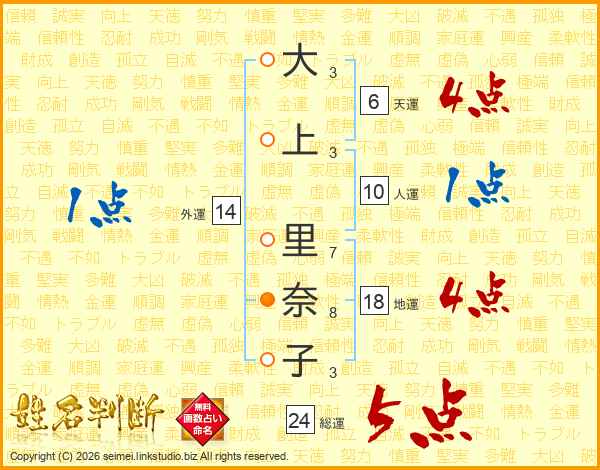 大(3画)上(3画) 里(7画)奈(8画)子(3画)