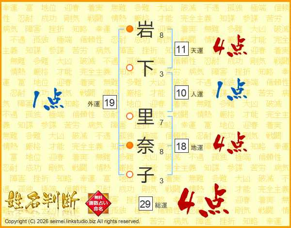 岩(8画)下(3画) 里(7画)奈(8画)子(3画)