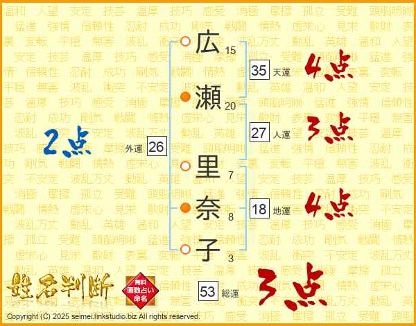広(15画)瀬(20画) 里(7画)奈(8画)子(3画)