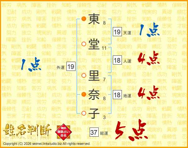 東(8画)堂(11画) 里(7画)奈(8画)子(3画)