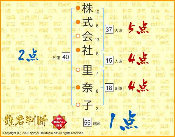 株(10画)式(6画)会(13画)社(8画) 里(7画)奈(8画)子(3画)
