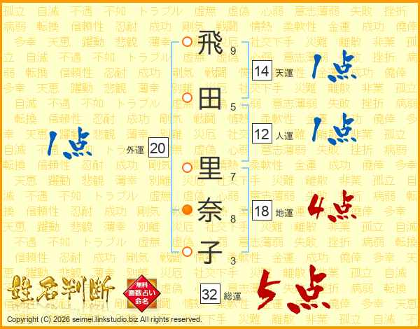 飛田里奈子さんの総運は32画の5点!