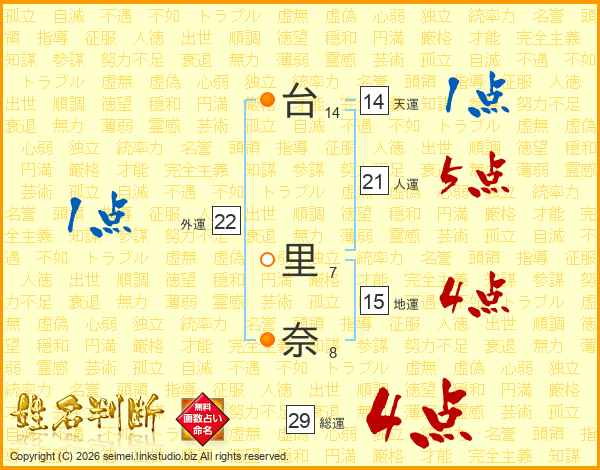 生活面を象徴する運勢です。外部から受ける影響力を表し、結婚運、家庭運や職場、環境への順応性を表します。総運から人運を引いた画数。姓や名が1文字の場合を除く。