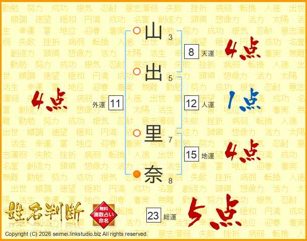山(3画)出(5画) 里(7画)奈(8画)