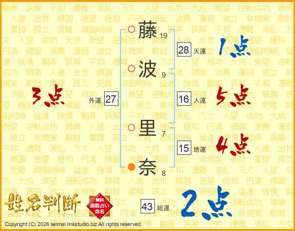 藤(19画)波(9画) 里(7画)奈(8画)