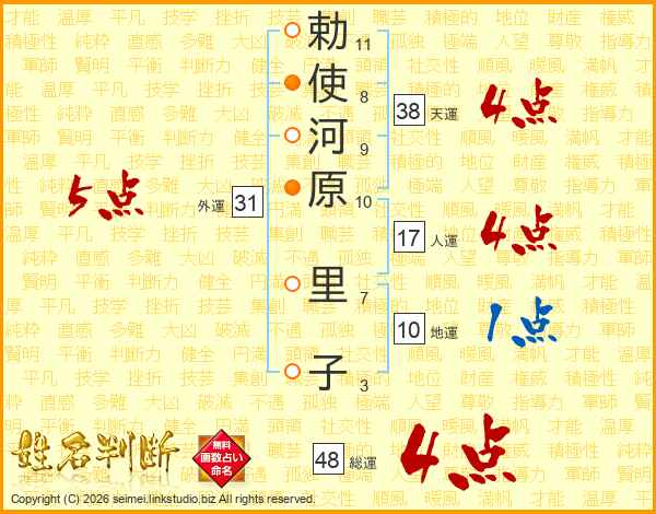 勅(11画)使(8画)河(9画)原(10画) 里(7画)子(3画)