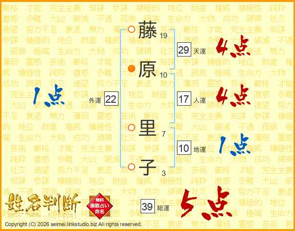 藤原里子さんの総運は39画の5点!