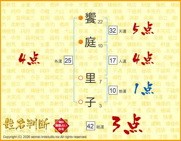 生活面を象徴する運勢です。外部から受ける影響力を表し、結婚運、家庭運や職場、環境への順応性を表します。総運から人運を引いた画数。姓や名が1文字の場合を除く。