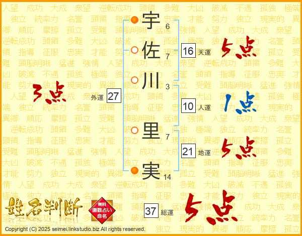 宇(6画)佐(7画)川(3画) 里(7画)実(14画)