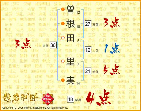 曽(12画)根(10画)田(5画) 里(7画)実(14画)
