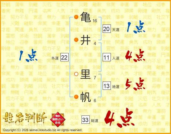 亀(16画)井(4画) 里(7画)帆(6画)