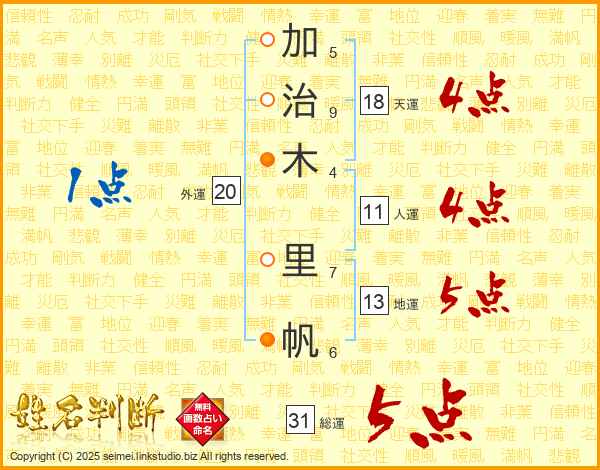 加(5画)治(9画)木(4画) 里(7画)帆(6画)